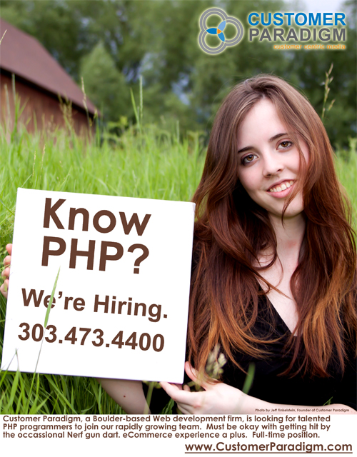 [PHP] PHP Programmers Needed Grokbase. (5 replies) I am looking to hire PHP programmers to help me in various projects I have going on. They all involve PHP, MySQL extensive knowledge and JavaScript would